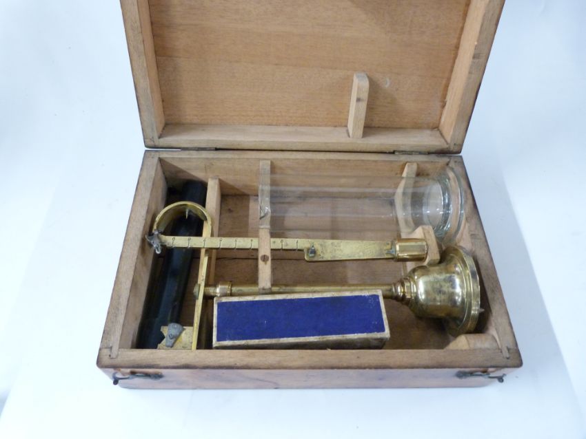19thC cased specific gravity beam scale with glass sample beaker, minimum height 20.5cm