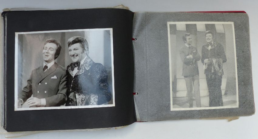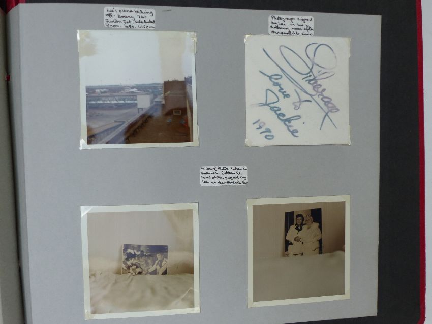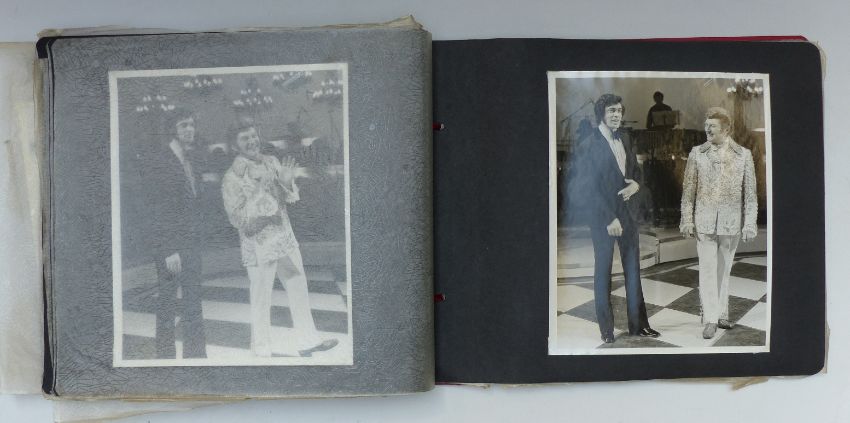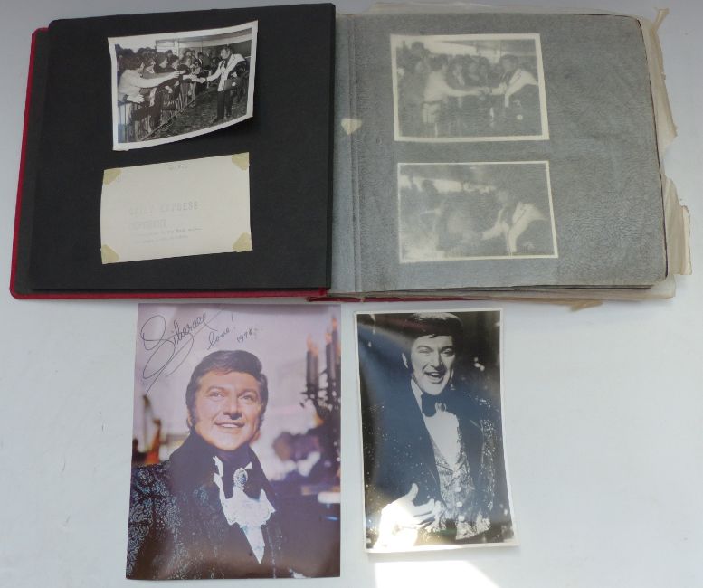 Album of Liberace photos with press examples some stamped with Daily Express copyright some also including Englebert Humperdink and Des O'Connor along with candid fan photos with annotation of when they were taken, one signed to reverse