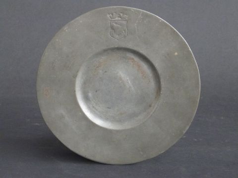 Pewter platter with crest to top, diameter 25cm