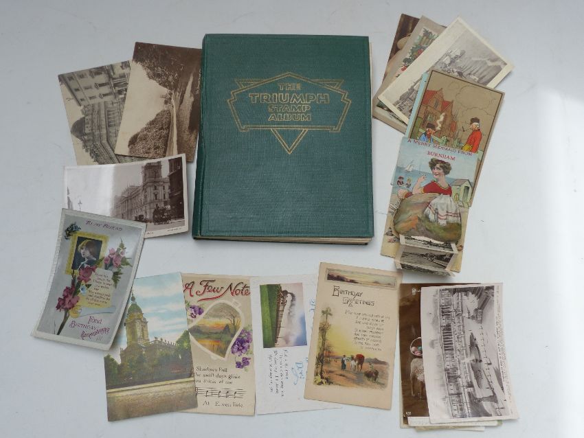 Triumph Stamp Album and small purse of stamps with vintage postcards including Cirencester Park, Burnham, novelty card and greeting cards