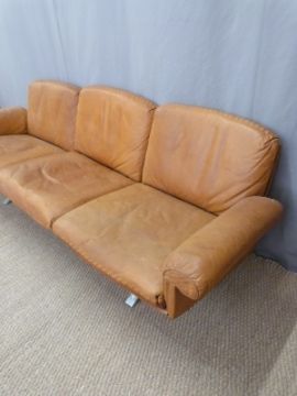 Retro leather sofa, probably 1970's Italian, with leather 'stitched' decoration, raised on twin steel quad bases, length 220cm