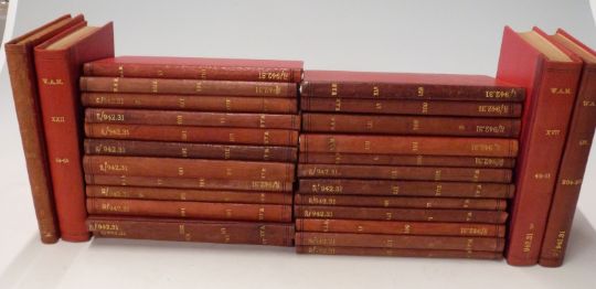 Wiltshire Archaeological & Natural History Magazine published in Devizes by Henry Bull, George Bell a large collection from 1854 volume 1 and ending with volume 67 from 1972 containing numerous maps, plates & charts mixed bindings, mostly half leather with gilt titles (approx 80 volumes) with 4 volumes of Wiltshire Notes & Queries vols 1,2 & 5 1893, 1896 and 1908