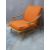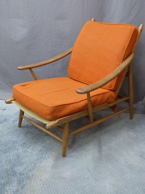 Ercol light elm low lounger chair 427-2 with matching footstool and original orange upholstered cushions