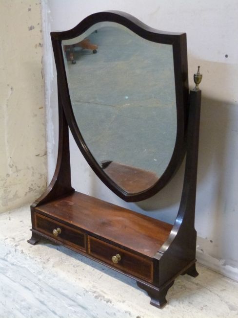 A 19thC inlaid mahogany bevelled glass shield shaped dressing table mirror, W54 x H79cm