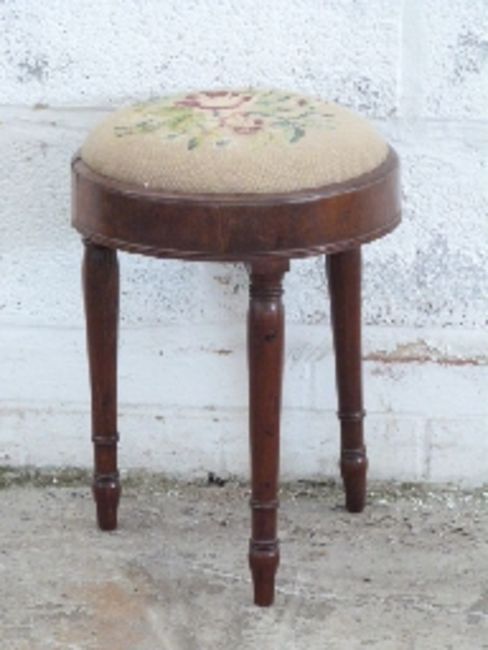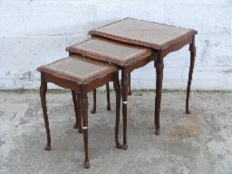 Nest of tables, upholstered stool and turned and carved candlesticks