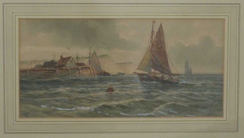 C. Blake watercolour 'Fishing Boats off Sandgate' signed and dated 1899 lower left and titled verso, approximately 16 x 33cm