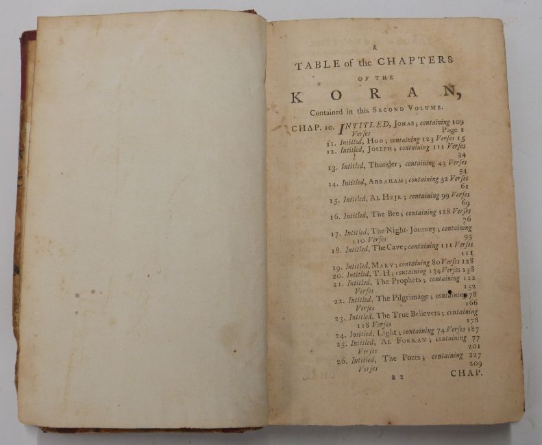 George Sale The Koran, commonly called The Alcoran of Mohammed, Translated into English immediately from the Original Arabic, with Explanatory Notes., printed for L. Hawes, W. Clarke and R. Collins 1764 in 2 volumes with engraved folding plans & tables, half red leather over marbled boards with hand written title labels