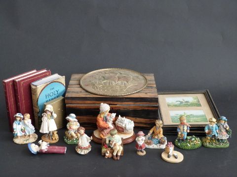 Coromandel wood box, prayer books, Leonardo figures, Jan Hagara figures, hunting prints, and a brass plaque of a galleon