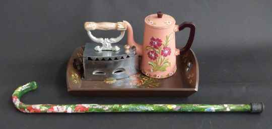 Bargeware walking stick, tray and kettle together with an iron
