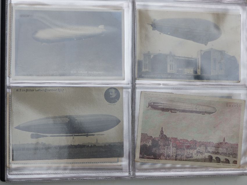 A large collection of German Zeppelin airship postcards dated from early 1900s to 1939 with some coloured examples. Includes many examples of the Graf Zeppelin LZ 127 (1928-1937) the most successful ever built, flying over one million miles and carrying 34,000 passengers, and the first commercial passenger flight over the Atlantic, round the world and over the North Pole. Images include the craft over Karlsruke, Mannheim, Dresden, Dusseldorf, Wappertal, Essen Munich, Basel, Toulon and New York. Also postcards of the Hindenberg LZ129 in the Olympic Ring Livery for 1936 with swastikas to the fins. Other images include large hangars, crash postcards, and images of L12 and 15, L28, R33, 34 and 101 etc. Approximately 250 in all