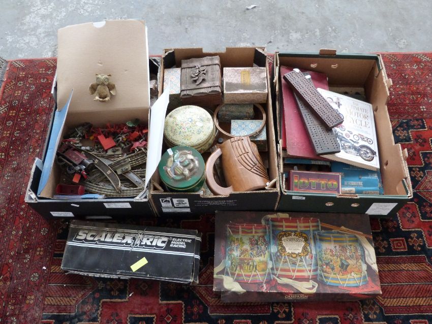 Quantity of toys including Hornby 0 gauage clockwork locomotive, Scalextric track, board games, boxes, tins and a large quantity of buttons including military examples