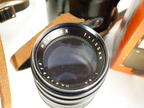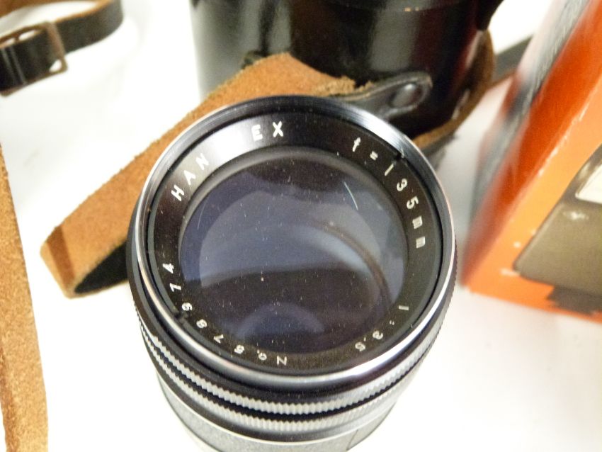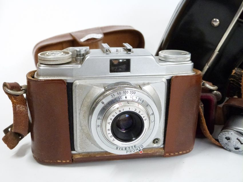 A quantity of cameras including Agfa Silette, Praktica PL Noval, Hanimex f=135mm 1:3:5 lens and enamel effect opera glasses
