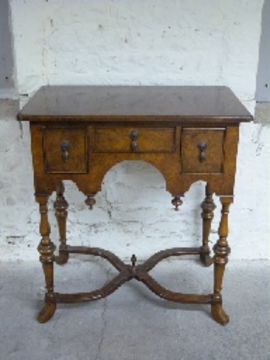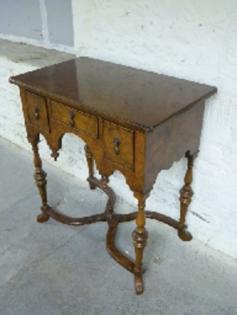 Queen Anne style walnut lowboy with oak drawer lining s and shaped cross stretcher uniting four turned tapering legs, W76 x D46 x H83cm