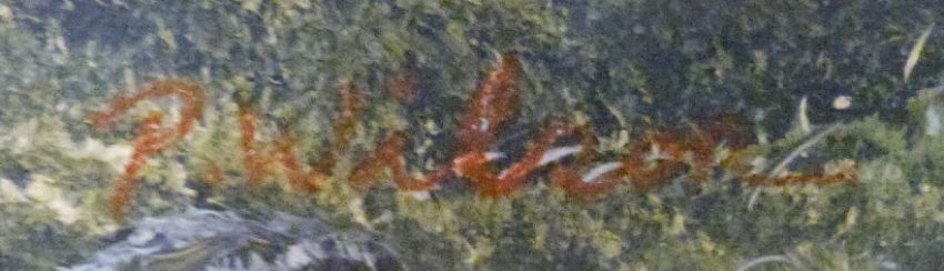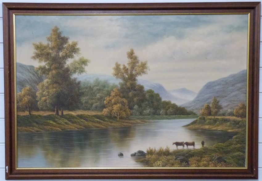 P Wilson oil on canvas cattle by a river in a mountainous landscape, 60 x 90cm