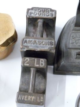 Three brass denture moulds or similar, two marked ADCO one Cotterell & Co, Crane Foundry Wolverhampton flat stacking weights, Siddons and Salter flat irons, AK 4lb weight etc