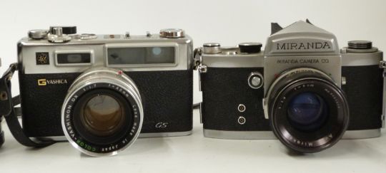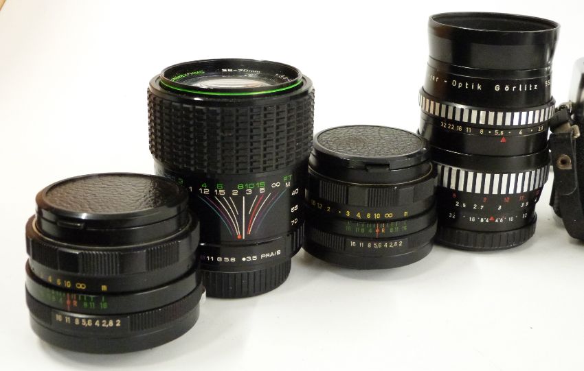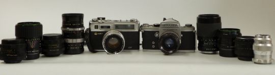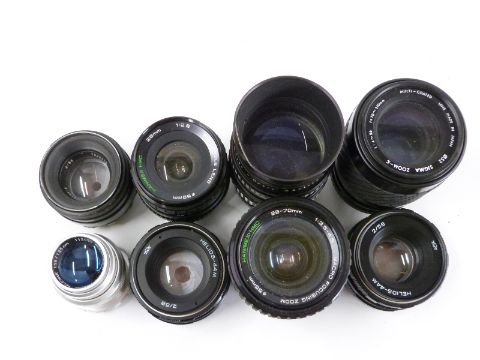 Quantity of SLR cameras, lenses etc to include Miranda with 1:1.9 f=5cm lens, Yashica Electra 35 with 1:1.7 L-45mm lens, three various Helios 2/58 lenses, Hanimex 28mm 1:2.8, Sigma 1:4 - 5.6 f= 70 - 210mm and Meyer Orestor 2.8 135, Hanimex 1:3.5 - 4.5 28-70mm and Roeschlein - Kreuznach Telenar 1:5.6/13.5 cm lenses