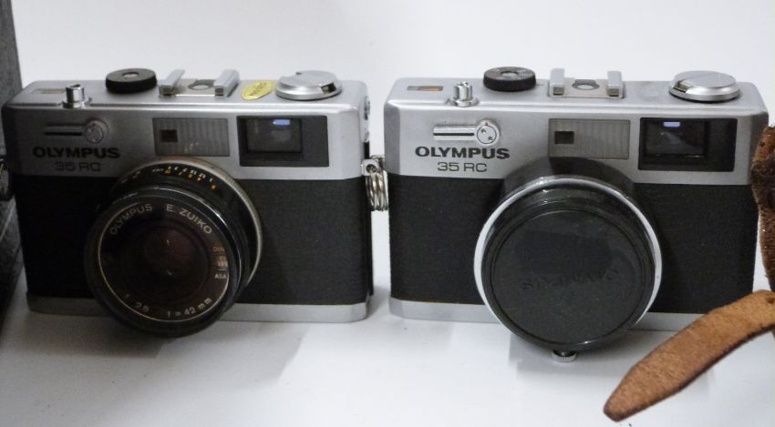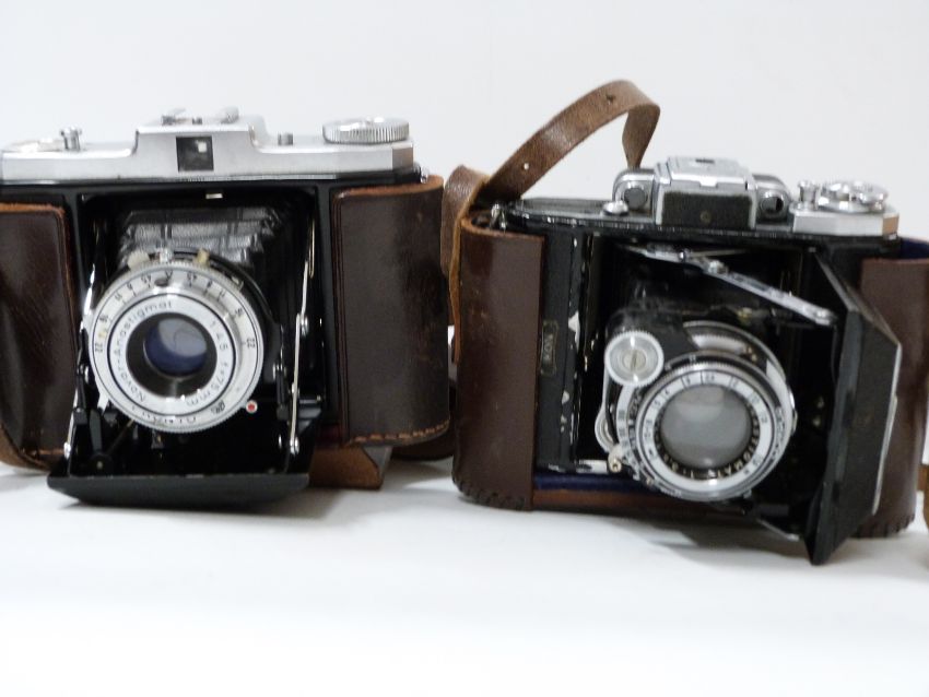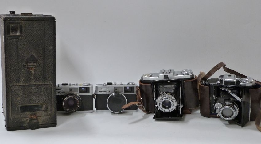 Quantity of cameras to include Sands Hunter large box camera, Zeiss Ikon folding camera, Olympus 35RC and a wooden tripod