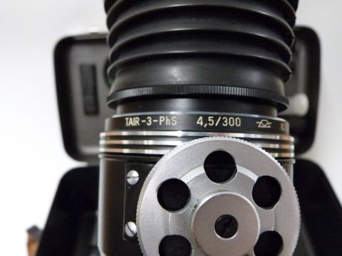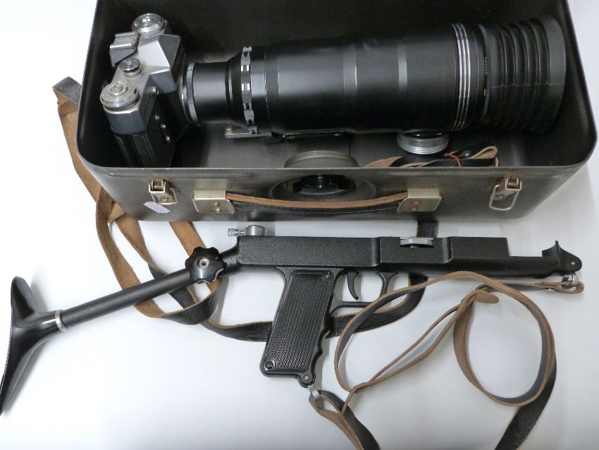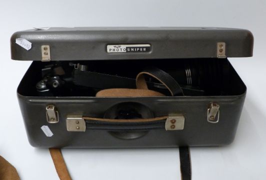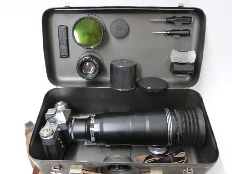 Zenit E photo sniper SLR outfit in carry case comprising Zenit E No 6353776, Tair - 3 - PLS 4,5 300 and Helios 2/58 lenses, filters, rifle type butt etc