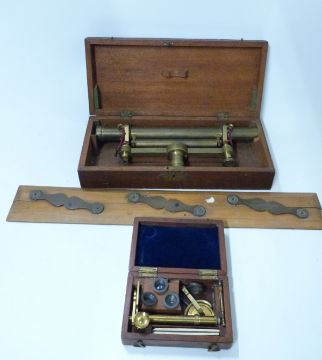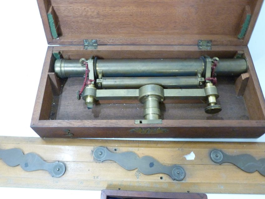 W&S Jones, 50 Holborn, London surveyor's level, small travelling microscope or magnifier and a walking ruler