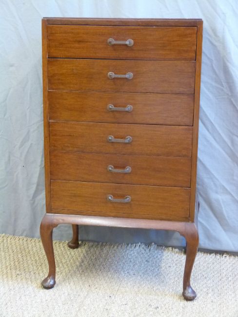A mahogany six drawer music cabinet / chest raised on cabriole legs, H87 x W48 x D37cm