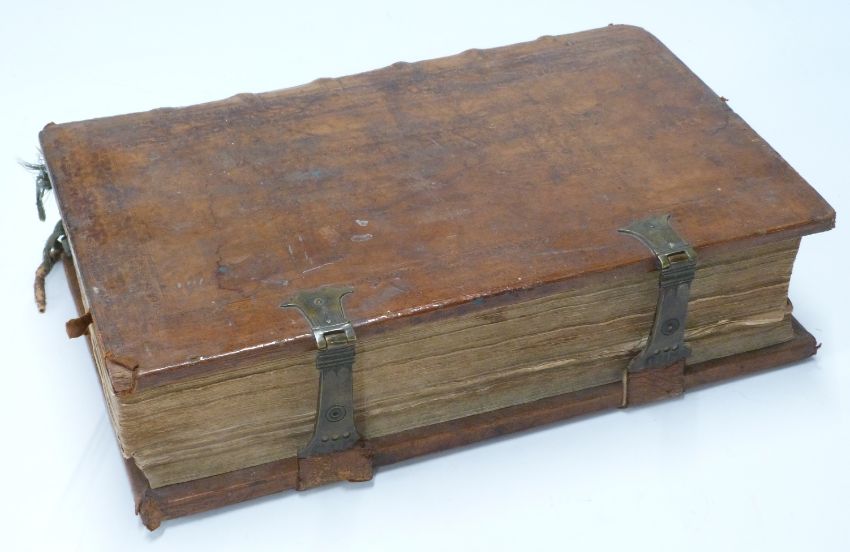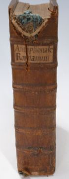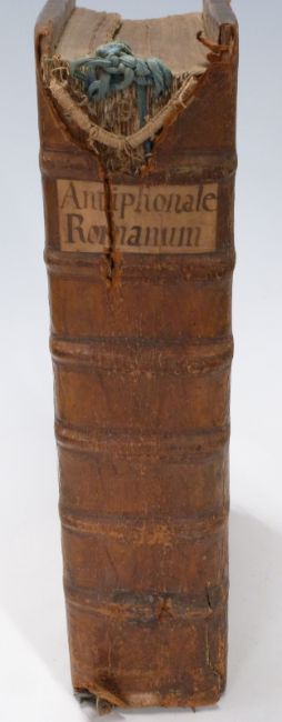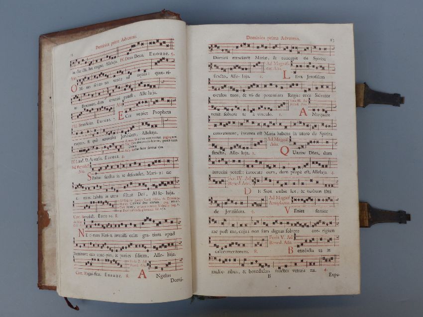Antiphonale Romanum Juxta Breviarium Ex Decreto Sacro-Sancti Concilii Tridentini Restitutum A. Clemente VIII. Pont. Max. Published Antverpiae, Joannem Baptistam Verdussen, 1750 Musical scripts printed throughout in red & black with neatly executed handwritten musical notation on half title bound in ornate blind embossed leather with decorated metal clasps held by leather straps, raised bands and paper title label