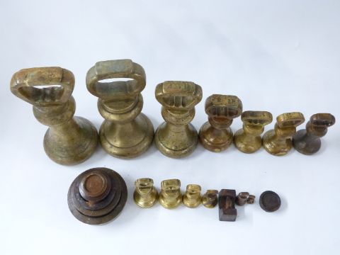 A run of bell weights 7lb downwards together with a further 7lb weight and a quantity of Avery and other weights