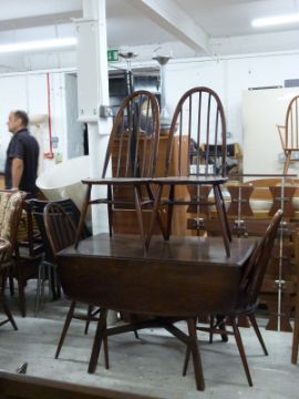 Ercol drop leaf dining table and four dining chairs, W122 x D112 x H71cm