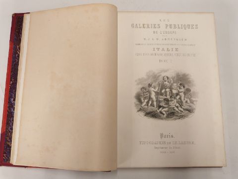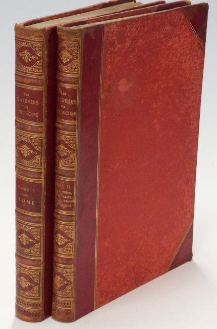 Les Galeries Publiques De L'Europe Italie by M.J.G.D. Armengaud illustrated with engravings Paris 1862-1866 in 2 volumes comprising Rome, Genes, Turin, Milan, Parme, Mantoue, Venise, Bologne, Pise bound in half maroon leather raised bands with elaborate gilt decorated panels and titling all edges gilt