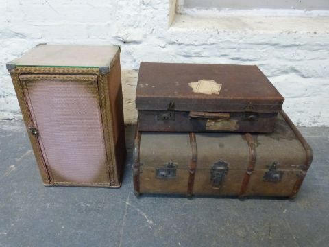Lloyd Loom style cabinet, laundry type basket, leather suitcase and an ash bound trunk