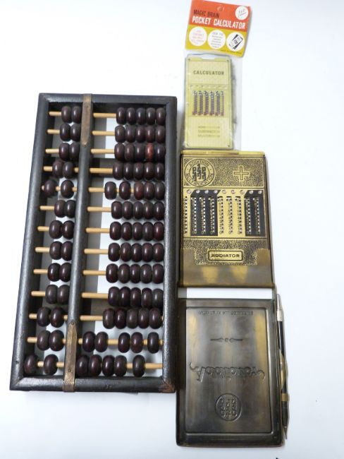 Brass Addiator addition and multiplication machine, marked M900019, with original stylus, similar modern example and an abacus