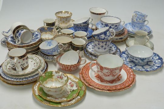 A collection of tea cups and saucers and coffee cans including Crown Derby and Spode examples