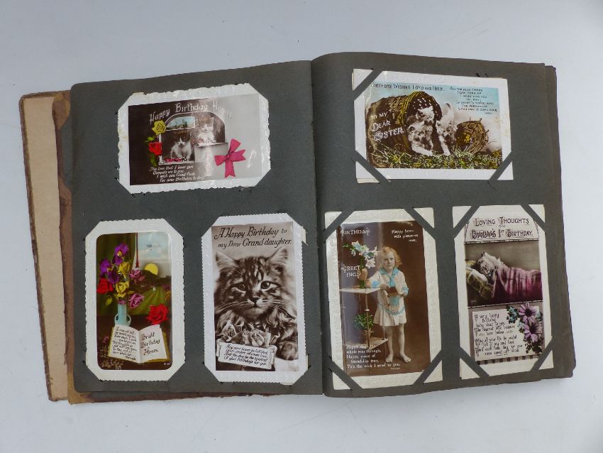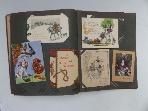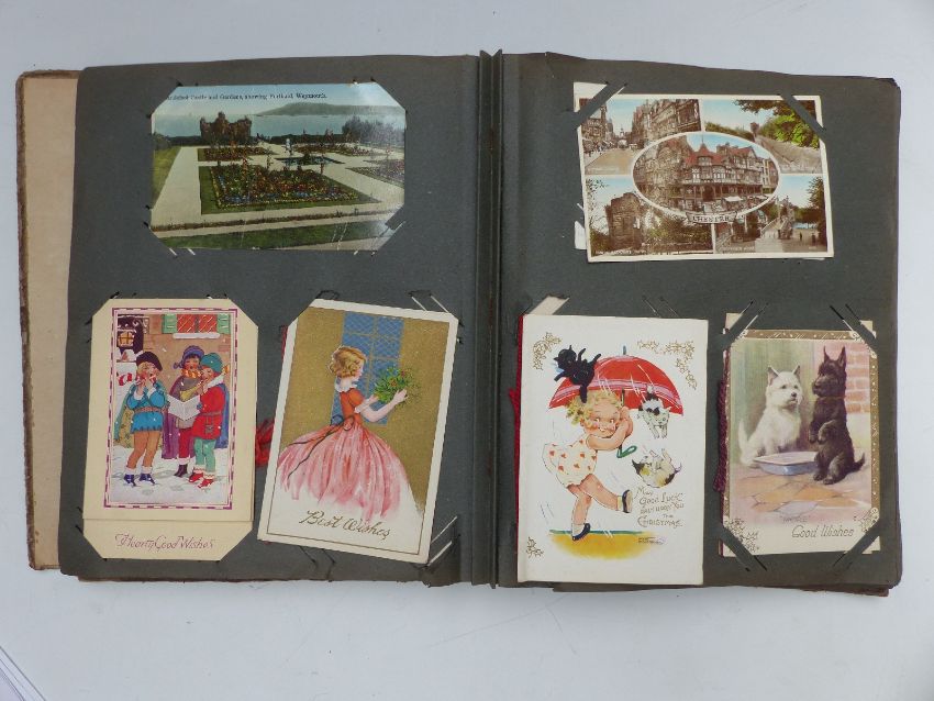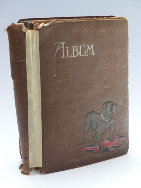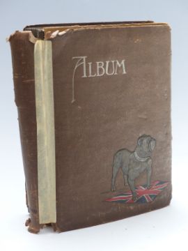 A British Bulldog early 20thC postcard album, subjects include greetings, Agnes Richardson cards, Barry Island, Wye Valley, Marlborough, Jersey etc, approximately 138 cards