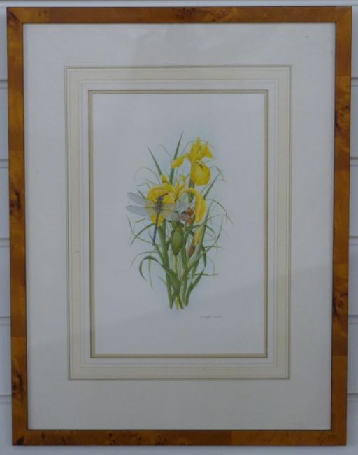 Bridgette James watercolour iris with dragonfly, 32 x 21cm