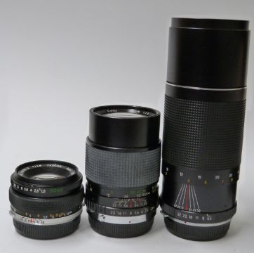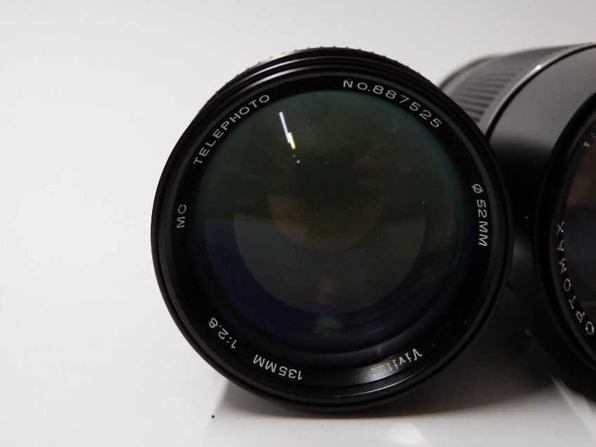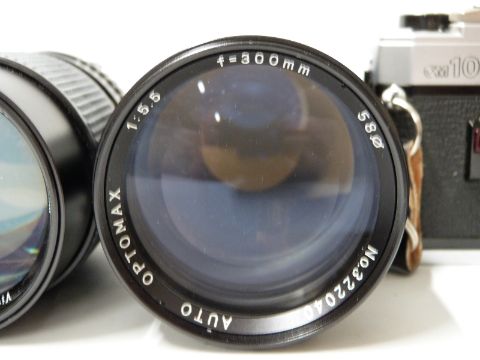 Olympus OMIO SLR camera with 1:3.5 f=28mm lens, Optomax 1:5.5 f=50mm lenses, bag etc