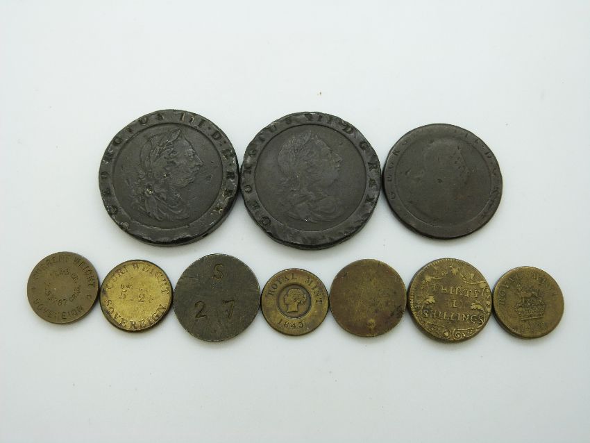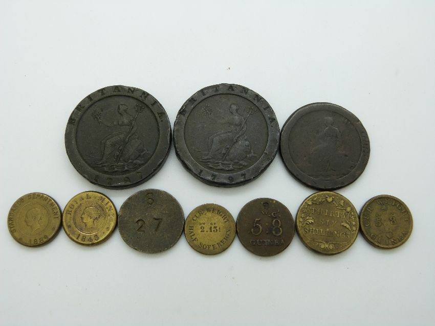 A quantity of various coin weights to include sovereign weights dated 1843 & 1889, Georgian coins etc