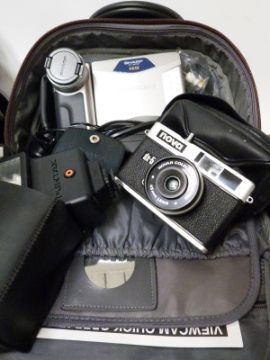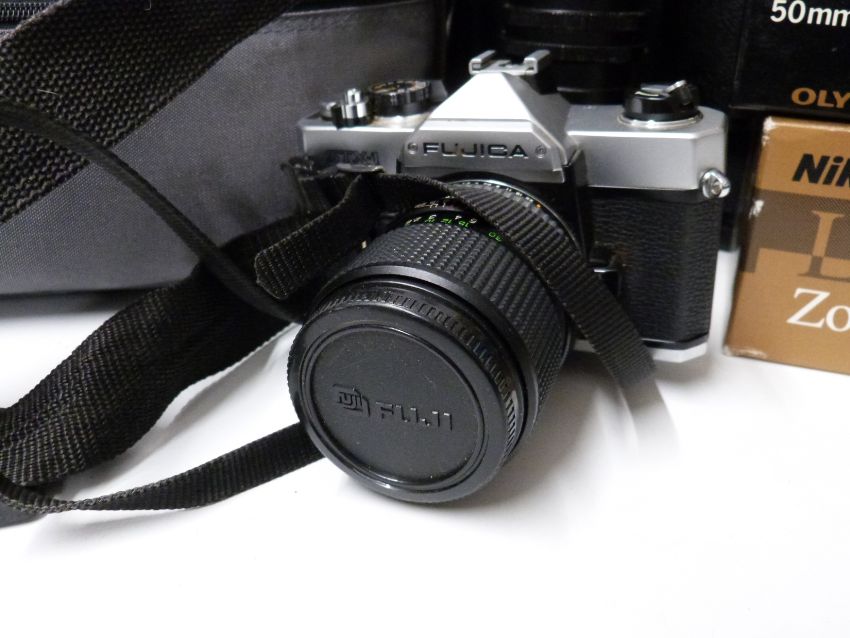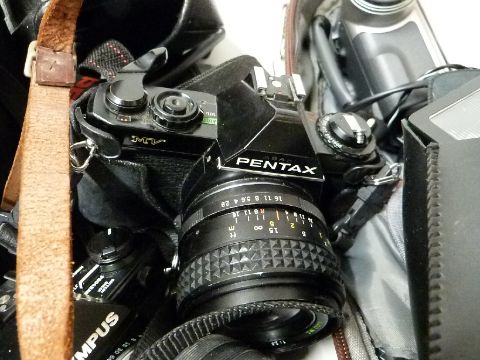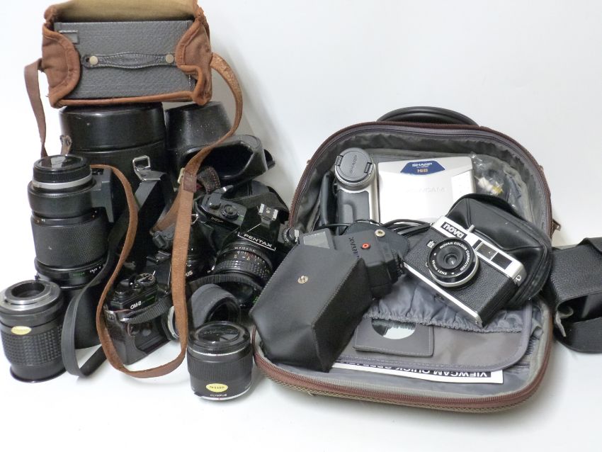 A quantity of cameras and accessories, including Olympus OM-2, Olympus 1:4,5 f=300mm lens, Pentax MV, Fujica STX-1, Box Brownie, Sharp camcorder and Prinz 10x50 binoculars