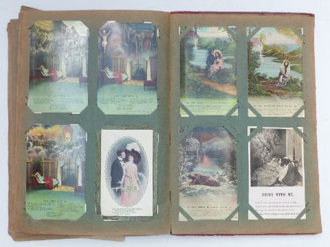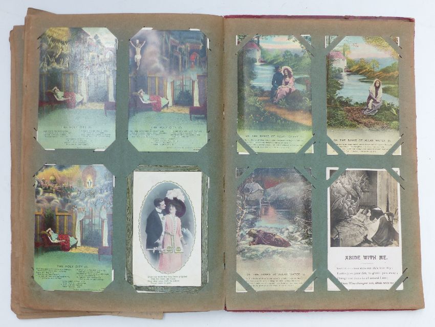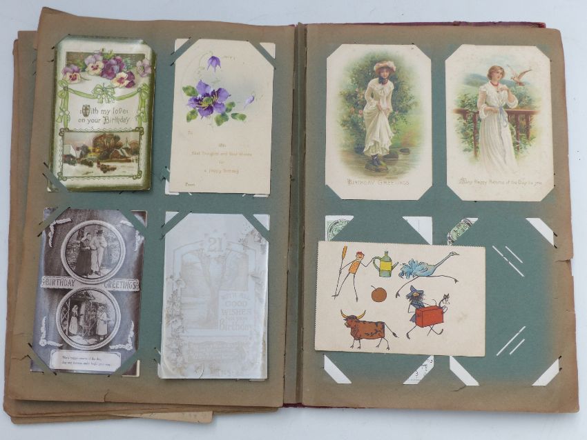 An album of approximately 130 early 20th century postcards to include Uncle Tom's Eastbourne Minstrels, portraits including Stroud examples, many cards corresponding between Stroud and Painswick, greetings cards including Dreamland examples etc