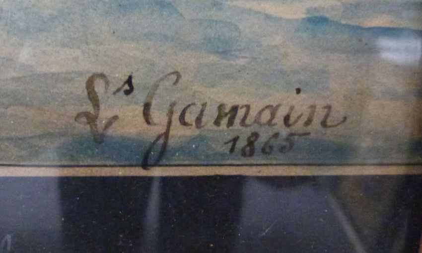 Louis Gamain 1803-1871 watercolour maritime scene sailing ship with coast beyond, signed and dated 1865 lower right and marked to lower edge 'Globe Cap'ne Baker Construit a Porsmouth (Portsmouth) en 1851 sous la direction de MP Distibecho', 49x61cm