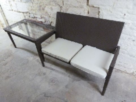 A contemporary garden or conservatory two seat bench sofa and coffee table with glass top, sofa width 122cm, table W120 x D60 x H54cm