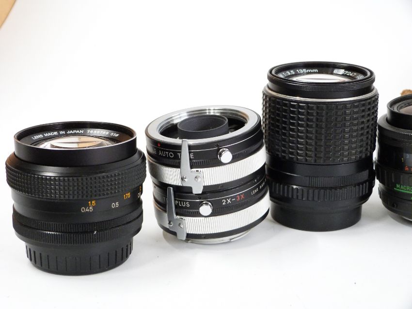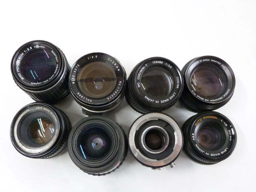 A quantity of camera lenses including Cosina and Pentax 135mm 1:3.5, Konica Hexanon AR 50mm F1.4, Chinon 1:1.9 50mm, Minolta 1:1.7 f=50mm, Soligor 1:2.8 f=28mm and Vivitar 100-400mm f4.5-6.7 lenses, Zeiss Ikon camera etc