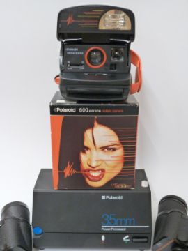 Polaroid 35mm power processor and 600 camera, and three pairs of binoculars comprising Regent 7x50, Boots Pacer 8x30 and Prinz 10x50mm (two cased)