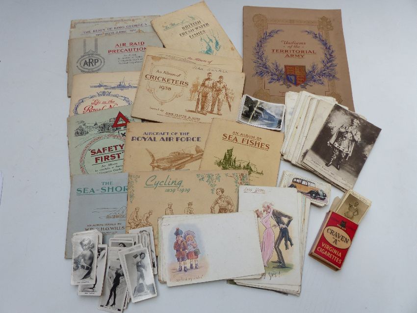 A quantity of cigarette cards, Edwardian humorous postcards etc