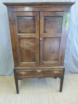 18thC/ 19thC oak two door housekeeper's cupboard on stand with dummy drawer, W98 x D46 x H168cm
