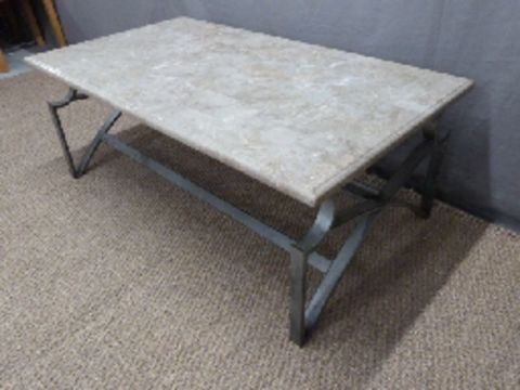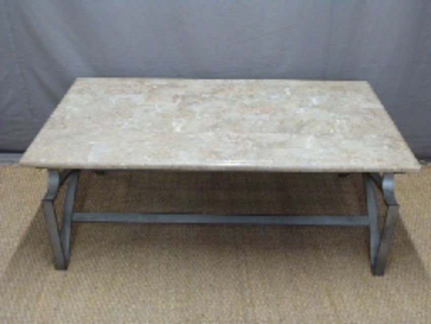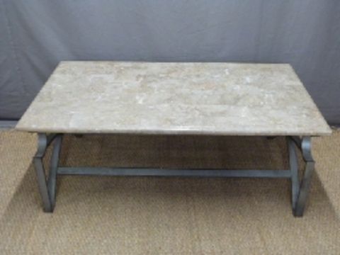 A marble topped and wrought iron coffee table, W126 x D70 x H48cm