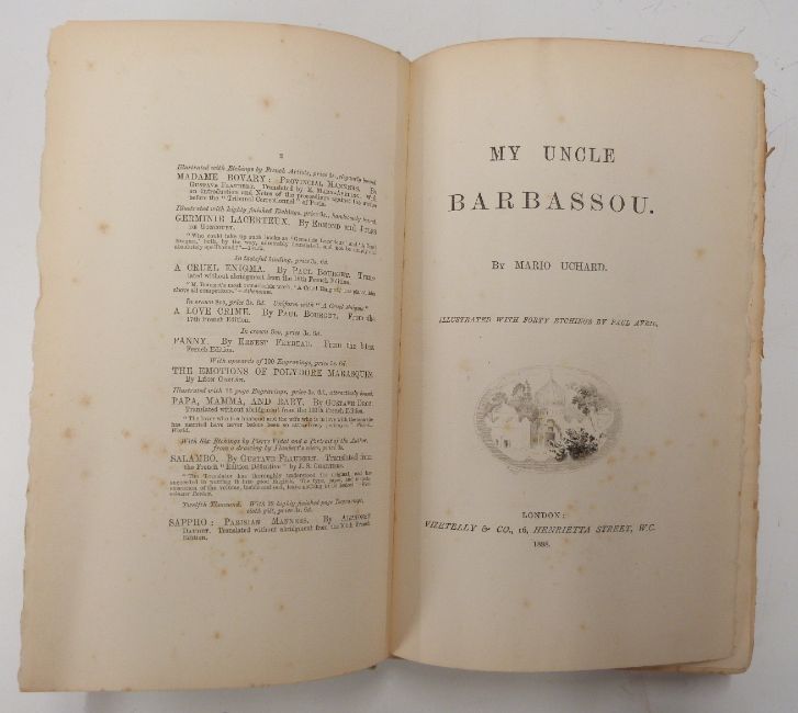 My Uncle Barbassou by Mario Uchard Illustrated with forty etchings by Paul Avril, Vizetelly & Co 1888 in blue cloth gilt lettered spine