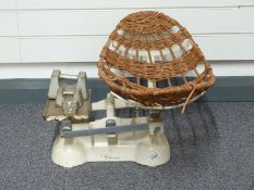 19thC shop beam scales with ceramic pan together with a quantity of weights