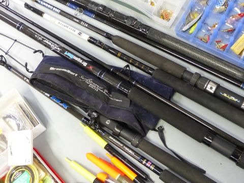 Salmon, pike and sea fishing equipment including Penn light boat rod with rollers, Shakespeare XK4000, Daiwa TDX B2050 boat rod, Dragonsurf 12ft Surfreaper beach caster, salmon and pike lures and flies, sea fishing hooks, leads, terminal tackle etc