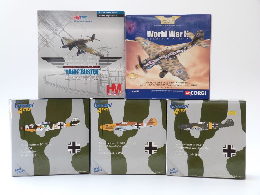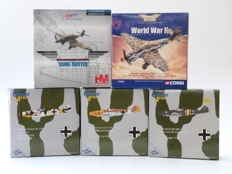Four 1:72 scale diecast model aeroplanes Corgi The Aviation Archive World War II Europe & Africa Junker JU-87R-2 Stuka Tropical AA32502, Hobby Master Air Power Series Stablo (P2) / SG2 'Tank Buster' and Gemini Aces Messerschmitt BP 109F-4, BP 109F2 (Trop) and BP109F-4, all in original boxes