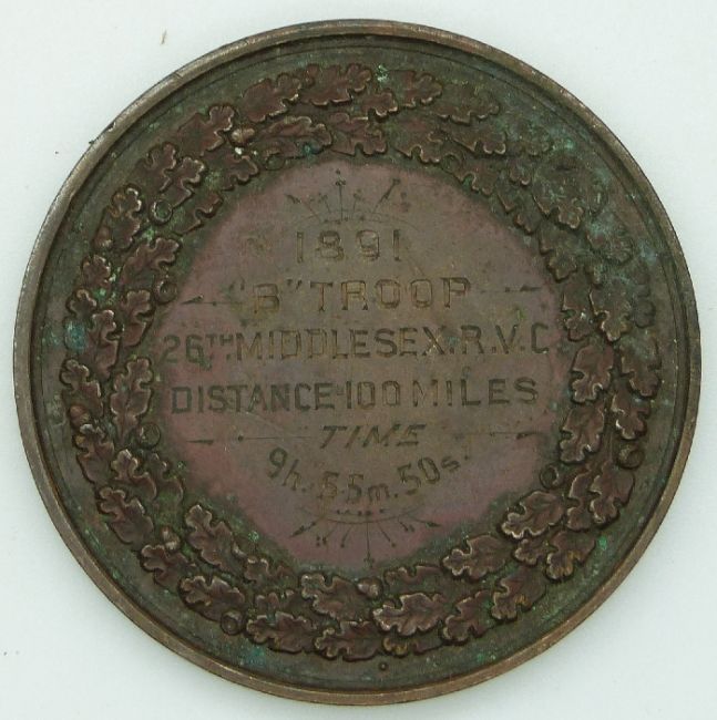 Victorian Volunteer Cyclists Long Distance Challenge Cup Medal 1891, awarded to B Troop, 26th Manchester RVC for 100 miles in 9hr 55minutes