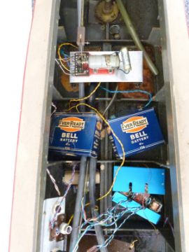 Vintage remote control wooden model boat with Taplin twin cylinder diesel engine and radio handset, 130cm long.